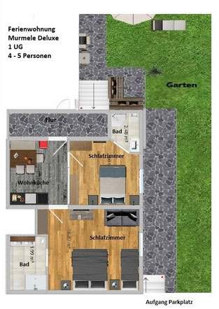Ferienwohnung MURMELE DELUXE im Tiefparterre mit eigenem Hauseingang : 2 Schlafzimmer, 2 Badezimmer und eine voll ausgestattete Wohnküche