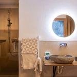 In the hallway access to another large dream bathroom, shower, toilet and natural stone sink, Luis Trenker toiletries and hairdryer.